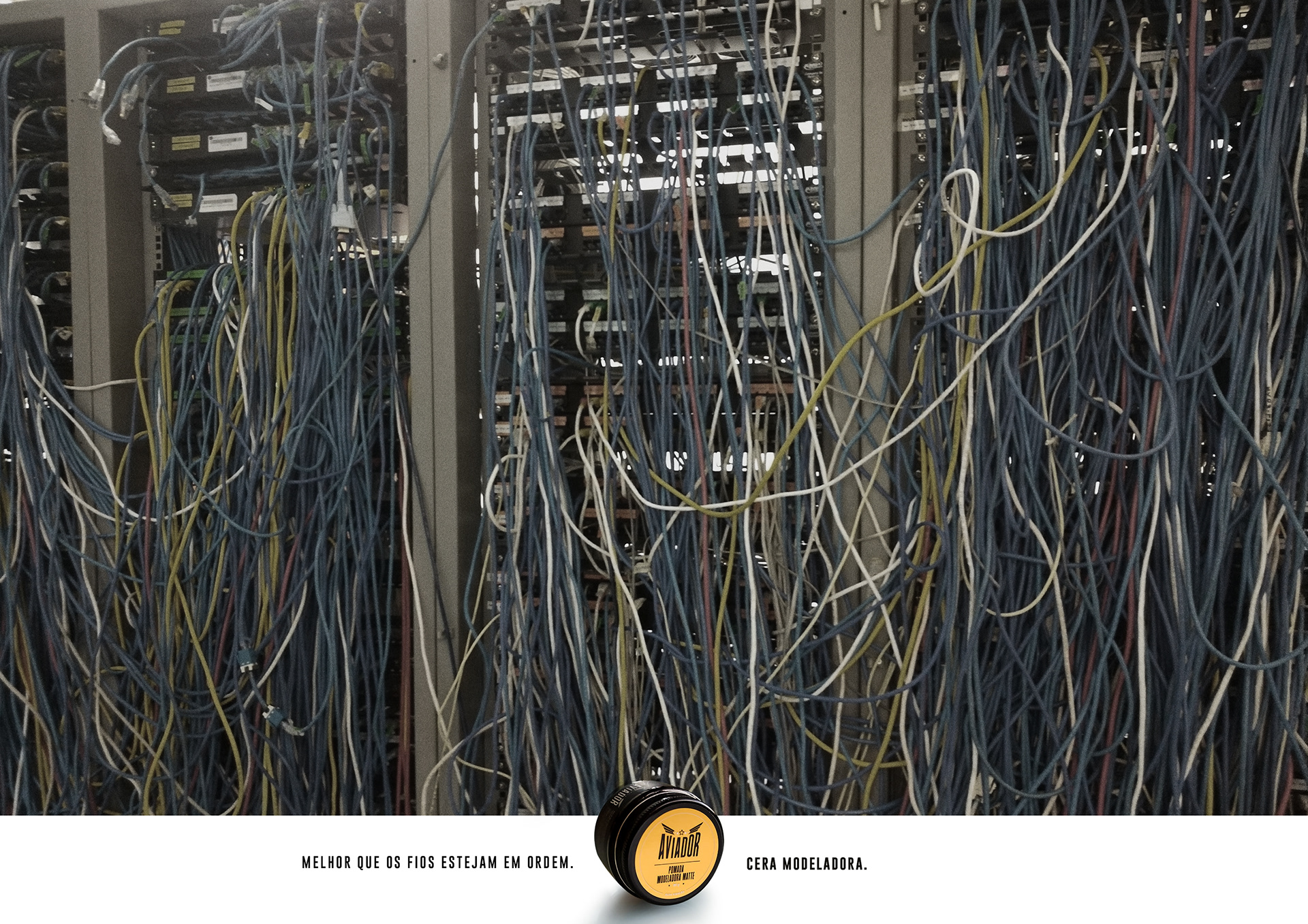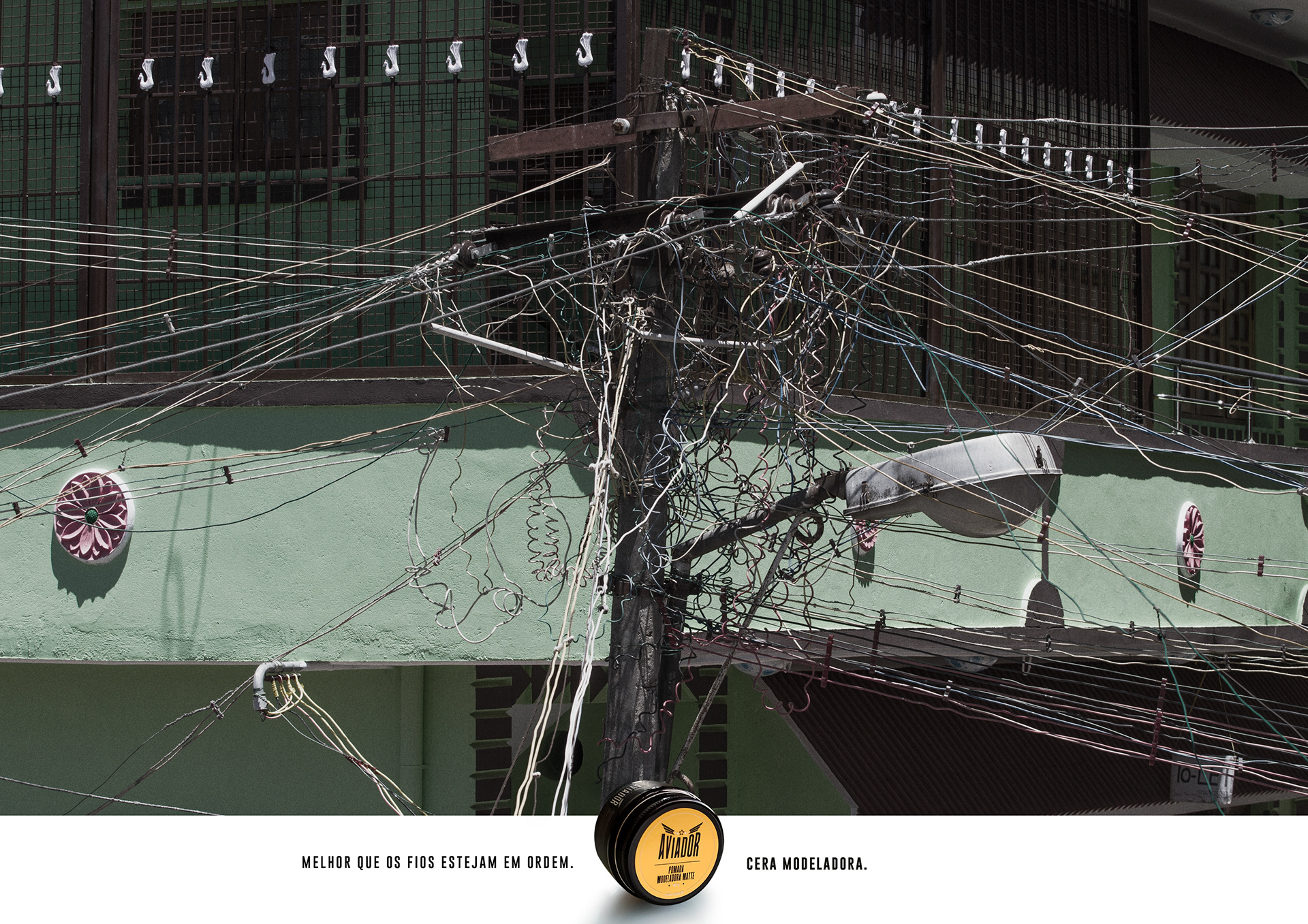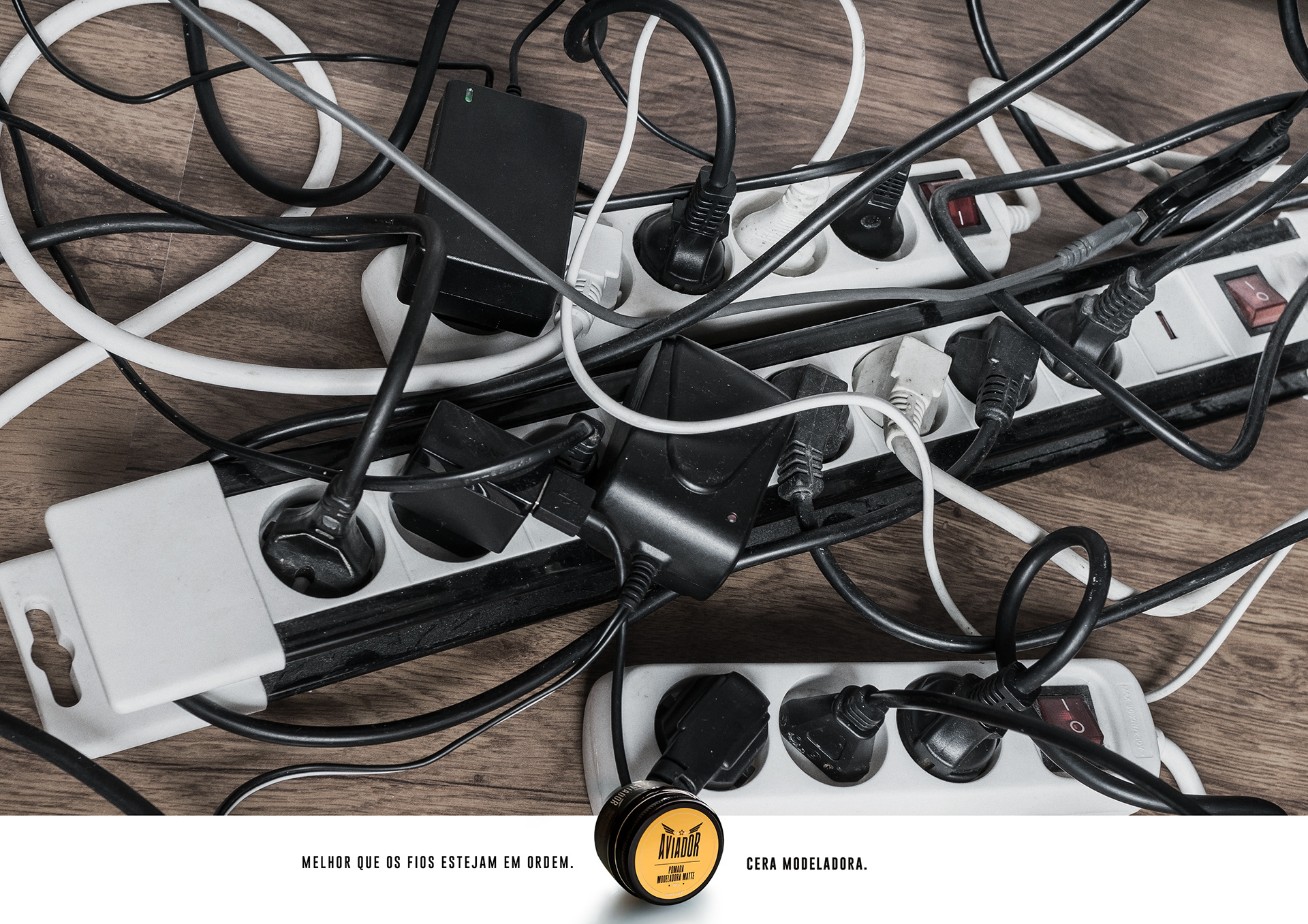 Para divulgar cera modeladora de cabelo que deixa os fios do cabelo intacto, série de anúncios faz uma comparação entre os fios elétricos, que costumam ficar embaraçados facilmente.
